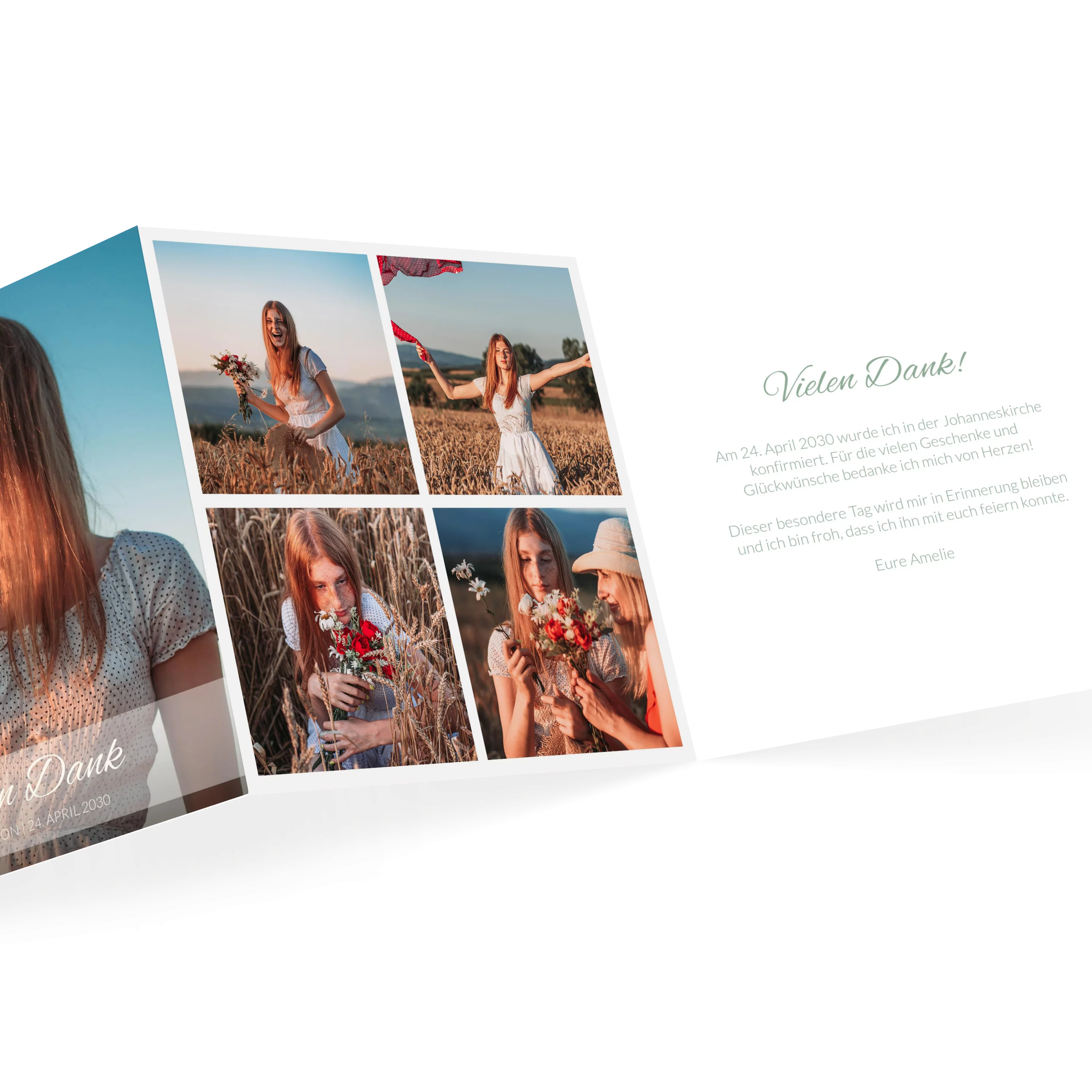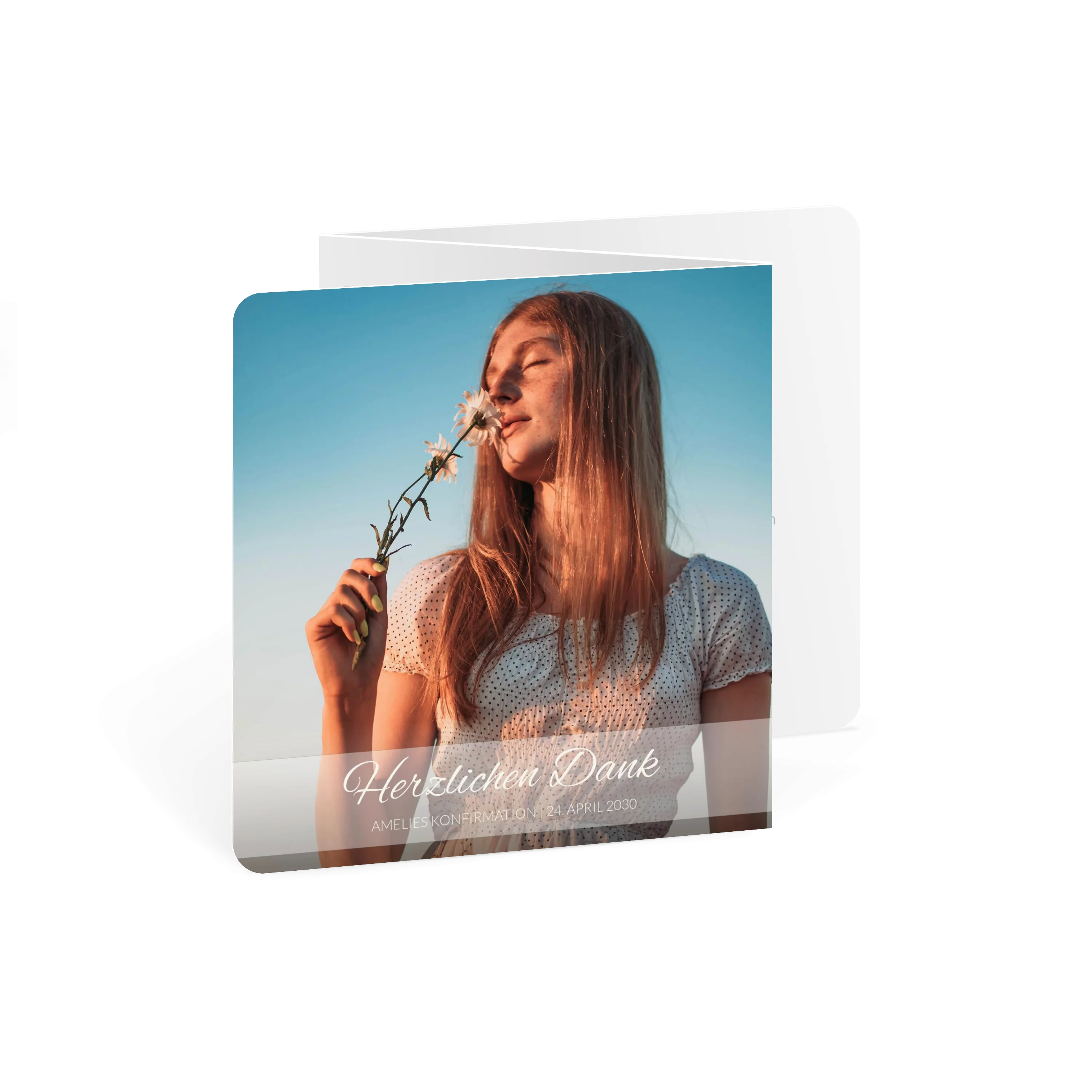 Vorne setzt ein großes Foto den Mittelpunkt, über dem ein transparentes Band liegt, auf dem der Text fein platziert werden kann. Die Rückseite zeigt eine warme Kraftpapieroptik. Ideal zur Konfirmation.