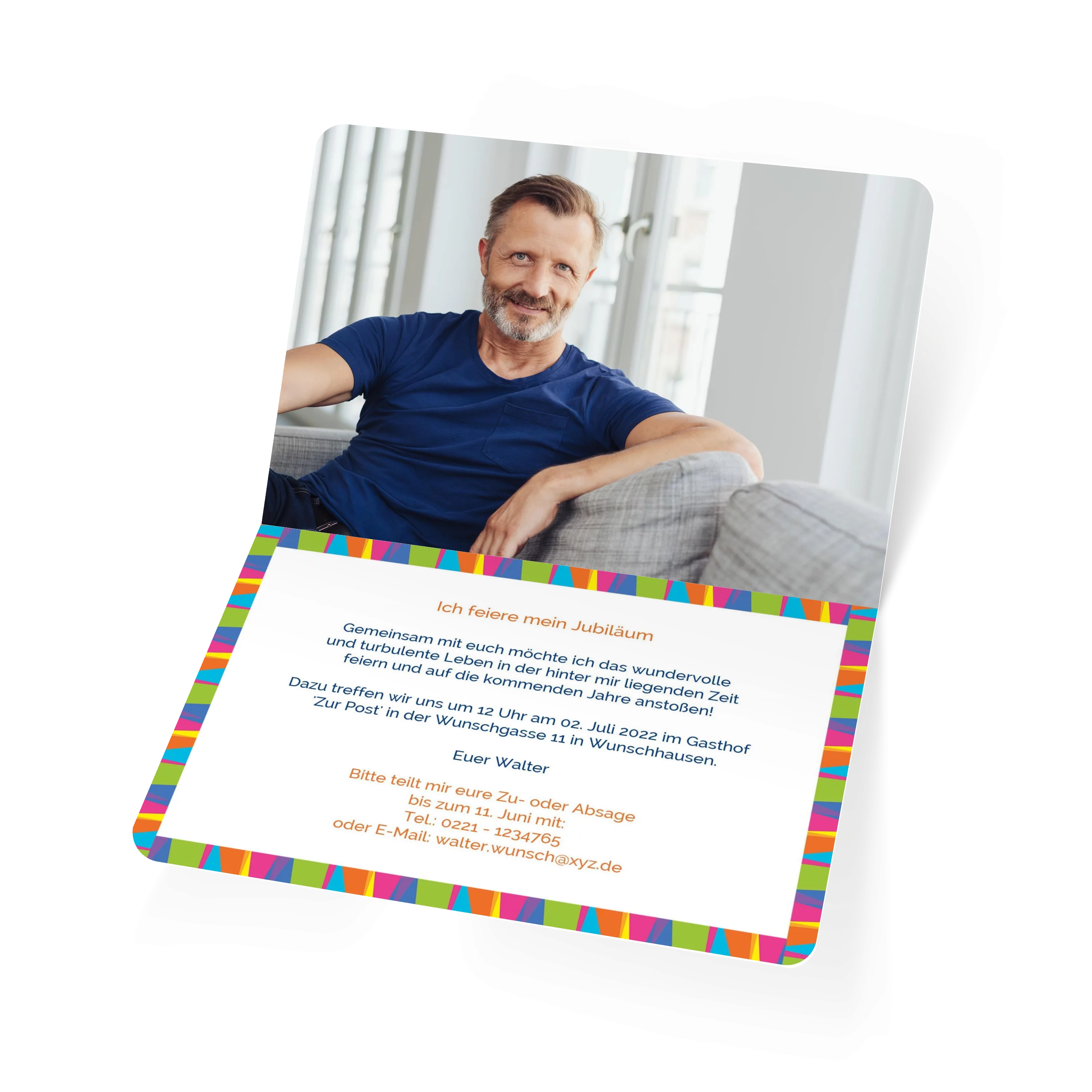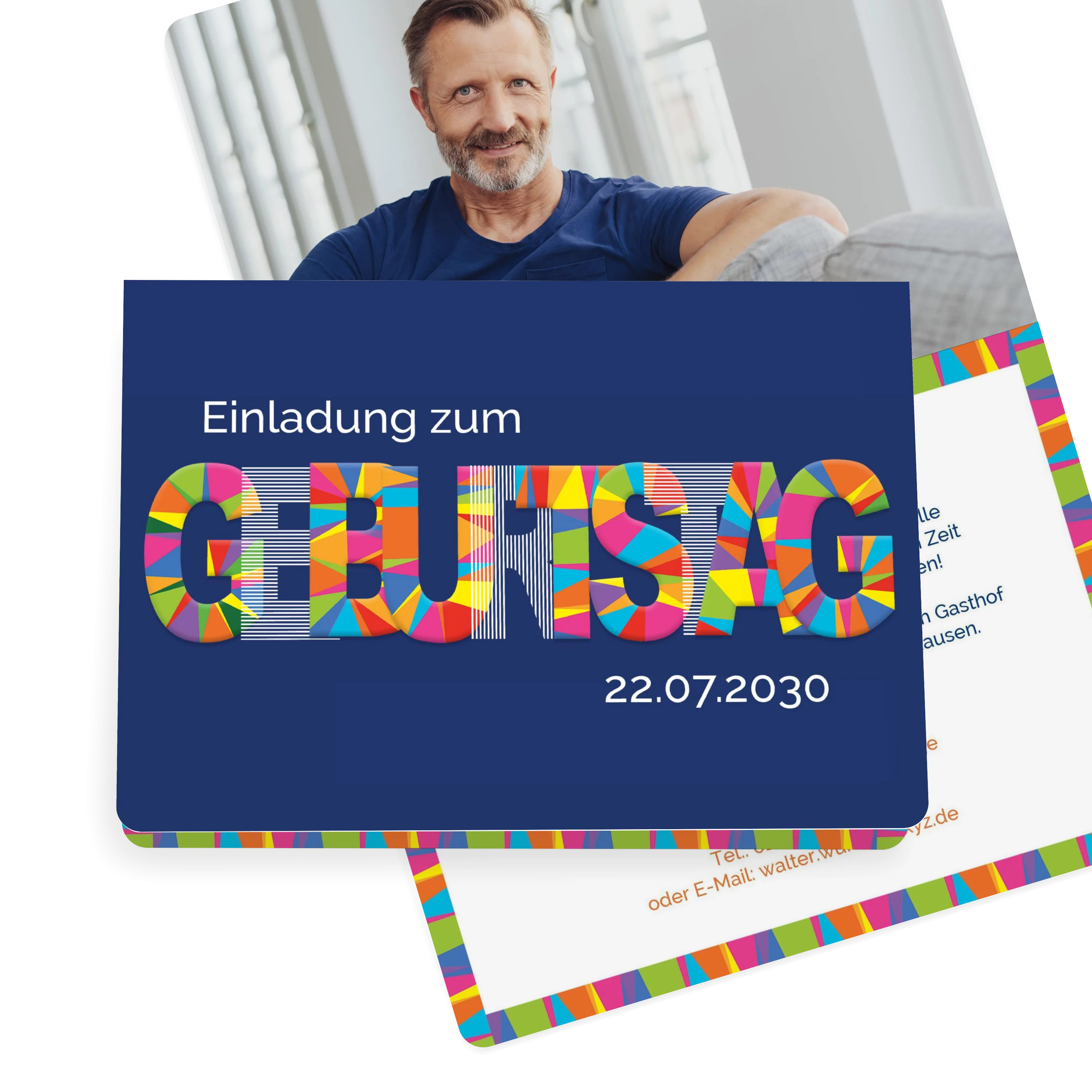 Ein kräftiges Dunkelblau trifft auf typografische Spielerei in allen Farben – eine Einladung, die auffällt und Spaß verspricht. Perfekt für eine lebhafte Geburtstagsfeier mit Gute-Laune-Garantie.